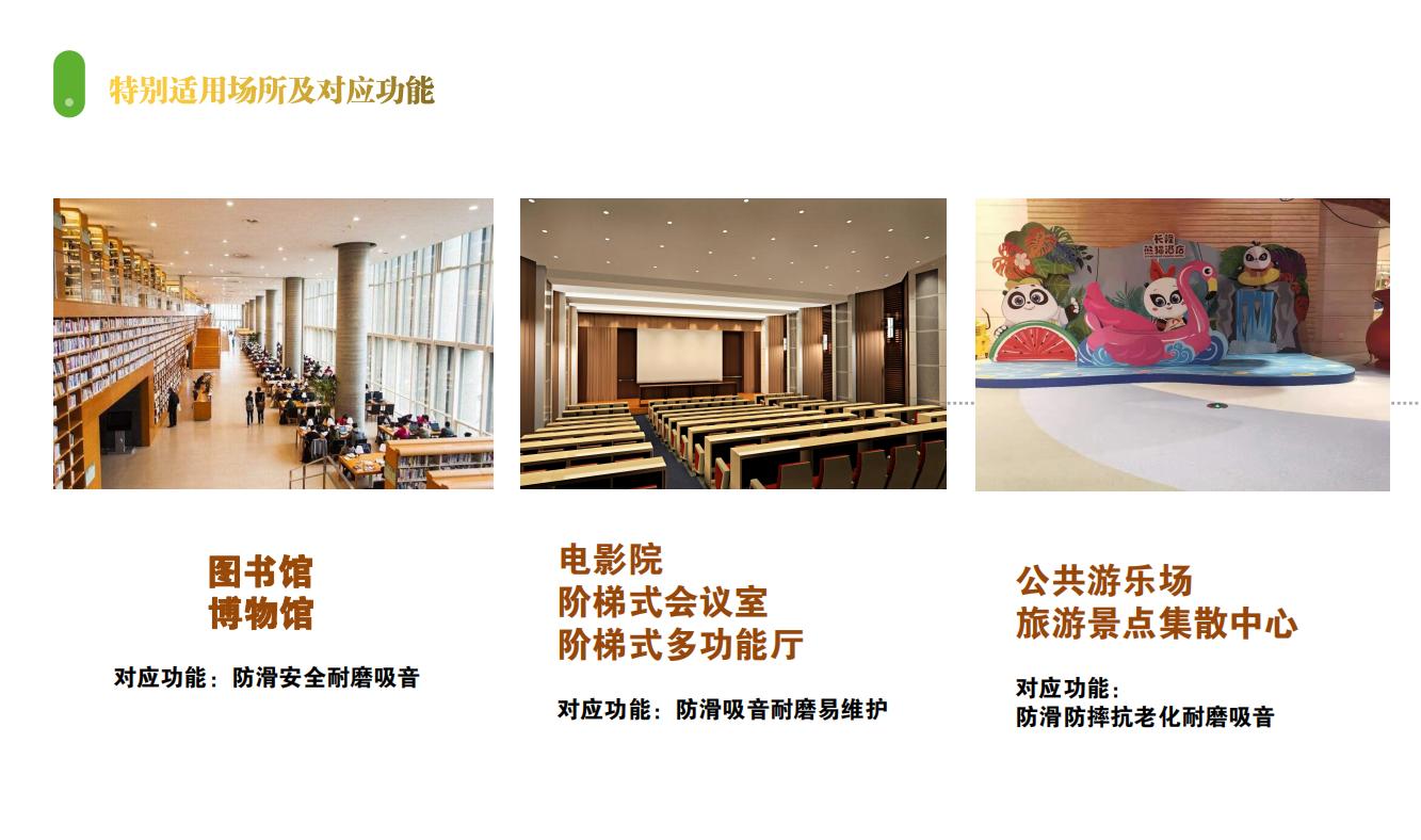 特別適用特點:3.7mm實心高彈力納米材料有著超強靜音性能,可營造高度安靜的行走環(huán)境;高回彈性保證了地面的高舒適性,可大幅減少因行少而產(chǎn)生的勞累。超耐磨性保證地面的超長使用壽命,避免地面頻繁維修更換。